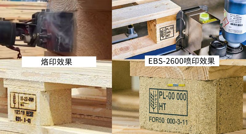 相对于烙印的方式,德国EBS-2600自动喷码机可以打印出清晰、精细的字体和Logo。喷印效果更加清晰美观,且印于表面的油墨不会破坏木材表面,影响木托盘本身使用寿命。