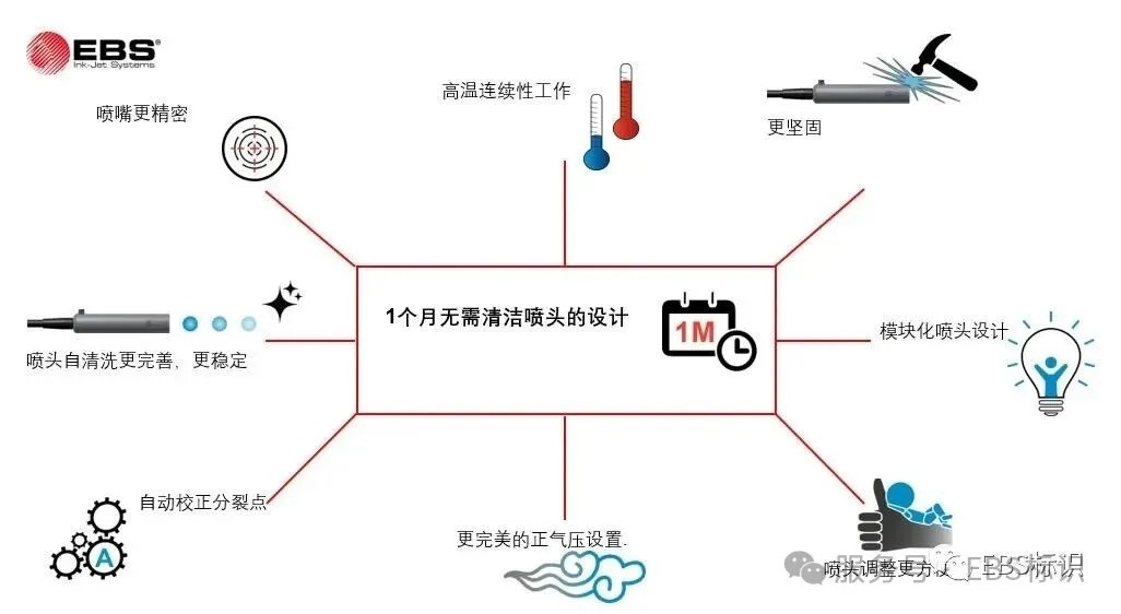 EBS-6900喷码机采用正,逆向双重清洗喷嘴设计,脉冲喷嘴清洗方式,确保喷嘴清洗彻底,畅通不堵塞。
